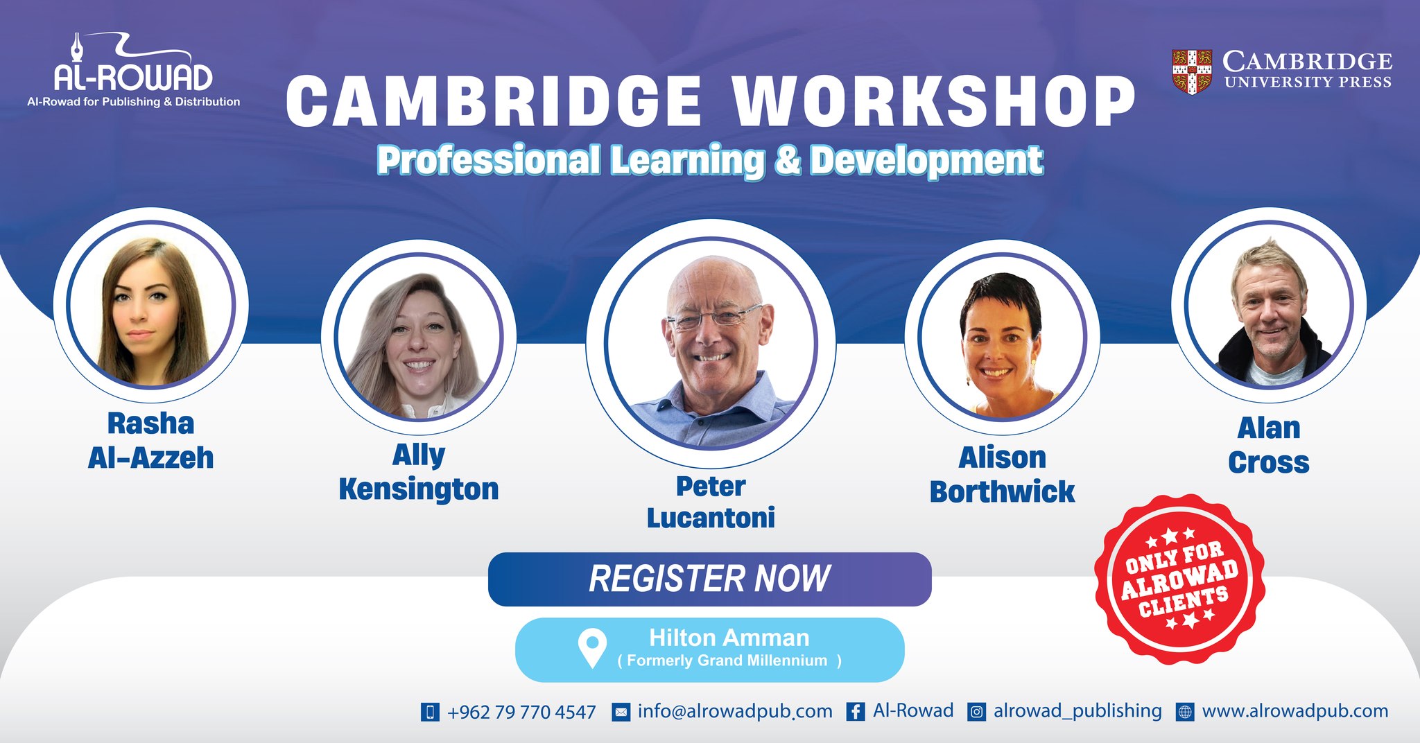 Cambridge University Press and Al Rowad for Publishing & Distribution are honored to invite you to the Annual Cambridge Curriculum and Online Platform Workshop that will be held on the 23rd (Adult English), 24th (Schools English), and 25th (Cambridge Learning for Schools) of August at Hilton Amman ( Formerly Grand Millennium).